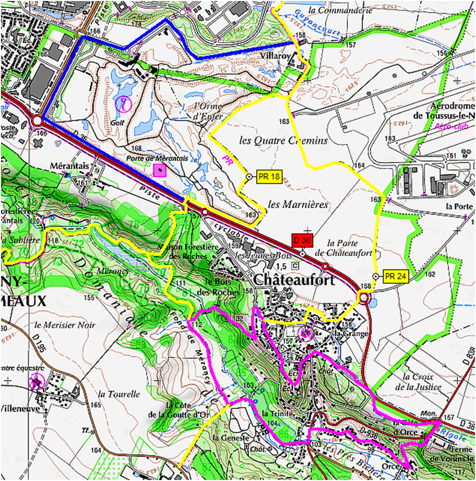 02/12/2024 Modification d'itineraire le PR18 coupé à Châteaufort 02/12/2024 Le PR 18 est coupé au nord de Châteaufort à cause des travaux de la ligne 18 du métro. Une déviation a été mise en place (en bleu, non balisée).