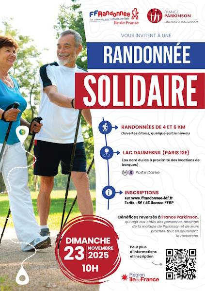 Le Comité de la Randonnée Pédestre d’Île-de-France aux côtés de l’association France Parkinson organise une matinée Rando Santé, ouverte à tous, le dimanche 23 novembre 2025 au bois Vincennes, au départ et à l’arrivée du lac Daumesnil (à proximité des locations de barques).